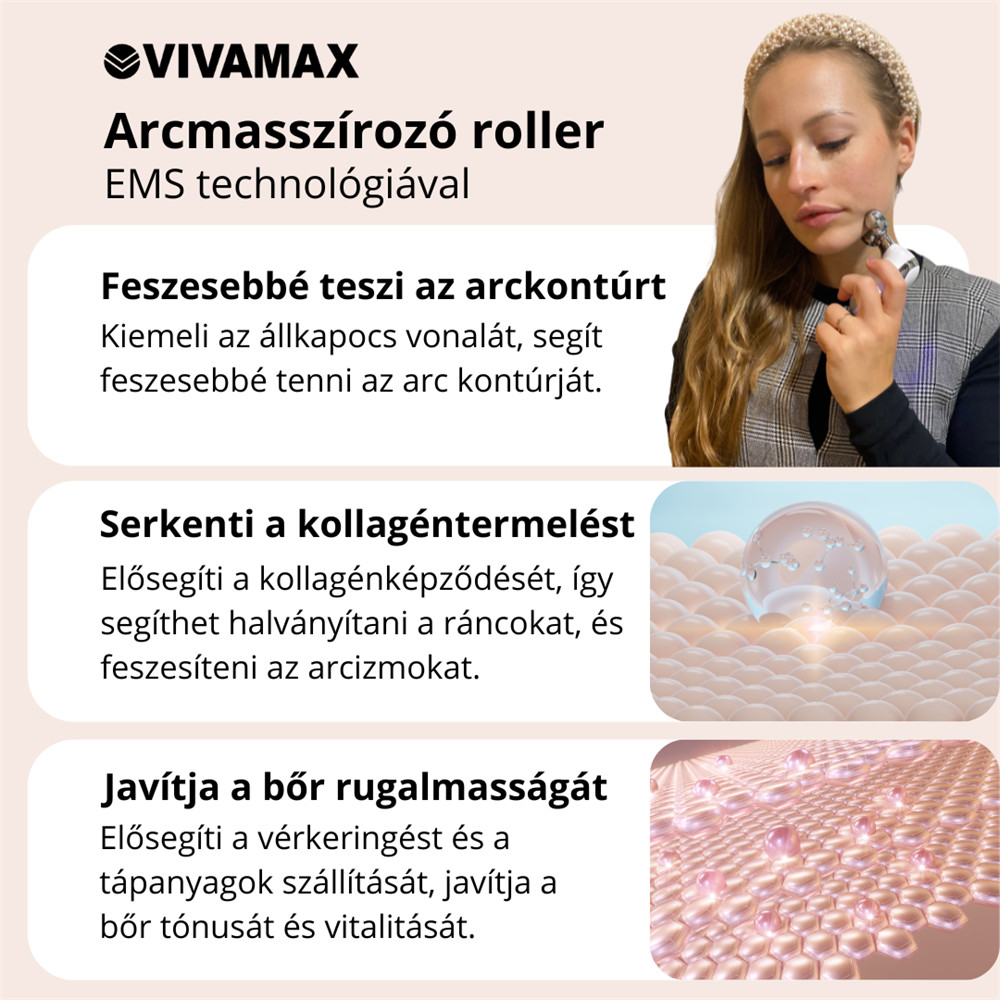 A Vivamax arcápoló készülék EMS mikroáram (galván ion) és vibráció segítségével serkenti a vérkeringést, stimulálja az arcon található akupunktúrás pontokat, valamint segít a meridiánok tisztításában. Az EMS mikroáram képes stimulálni a bőr alatti szöveteket, aktiválni a sejteket, elősegíteni a kollagén termelés serkentését, ezáltal feszesebbé és ragyogóbbá téve a bőrt. Kompakt mérete és akkumulátoros kialakítása miatt könnyedén hordozható, így akár utazásokra is magával viheti, ergonomikus formája kényelmes és biztonságos fogást biztosít a kezelések során.