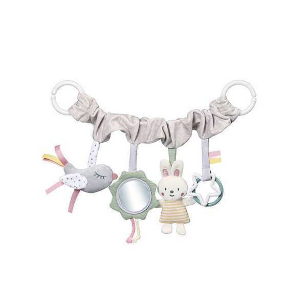 Nature függő játék babakocsiba és autósülésbe egy szenzoros termék, amely képes stimulálni a gyermek tapintását és látását, valamint javítani motorikus képességeit. Mindössze annyit kell tennie, hogy rögzíti a babakocsira, bölcsőre vagy autósülésre, hogy szórakoztassa a gyermeket séták és utazások során. A szövetbe burkolt függő tárgy kellemes tapintású, és csörgő madárral, biztonságos tükörrel és kiálló zsinórokkal, zörgő nyuszival, valamint gyűrűvel és csillaggal van ellátva. A gondosan kiválasztott darabok vonzóak és felkeltik a gyermek figyelmét. A kicsi játszhat, felfedezheti a világot, és fejlesztheti látását és hallását.Praktikus rögzítés:A praktikus és univerzális rögzítő segítségével a játékot a babakocsihoz, autósüléshez és kiságyhoz is rögzítheti.Csörgő:A madár által kibocsátott finom csörgés felkelti a baba figyelmét és nyugtató hatású.Zörgő játék:A nyuszi belsejében rejtett zörgő darabok lekötik a babát, és egyúttal fejlesztik a kognitív képességeit.Biztonságos tükör:A rugalmas tükör lehetővé teszi a babának, hogy lássa saját tükörképét. A tükröt színes zsinórok veszik körül, amelyek felkeltik a figyelmet. A gyermek könnyen megfoghatja őket, és felfedezheti az anyag textúráját.Különböző textúrák:Ha hagyja, hogy gyermeke különböző textúrákat érintsen, gazdagítja érzékszervi élményeit.Oktató játék:Mivel a darabok változatosak, a babával való játék kreatív. Meséljen neki egy történetet a madárról és a nyusziról.Műszaki jellemzők:Anyag: 100% poliészterMéret: 35 cm x 20 cmBaba életkora: 0 hónapos kortólBiztonsági információk:Rögzítse a játékot a gyermek elérhetőségén kívül. A lehetséges balesetek elkerülése érdekében távolítsa el a játékot, amikor a gyermek elkezd próbálkozni a kéz- és térdállásban való mászással.Távolítson el minden biztonsági elemet a játékról, amelyek veszélyesek lehetnek a gyermek számára.Minden alkalommal ellenőrizze a játék minőségét, mielőtt a gyermeknek adná. Csak a sértetlen játék biztosítja a gyermek biztonságos használatát. Dobja el a játékot, amint az első sérülés jeleit észleli.Ajánlott felnőtt felügyelete mellett játszani.A játék megfelel az EN 71 szabványnak.Javasoljuk, hogy a csomagolást őrizze meg referenciaként. A csomagolást tartsa távol a gyermekektől. A csomagolás és a rögzítő elemek nem játékok, és egészségügyi kockázatot jelenthetnek a gyermek számára.Szállító: Babyono sp. z O.O., Kowalewicka 13, 60–002 Poznań, Lengyelország. +48 61 83 90 520,