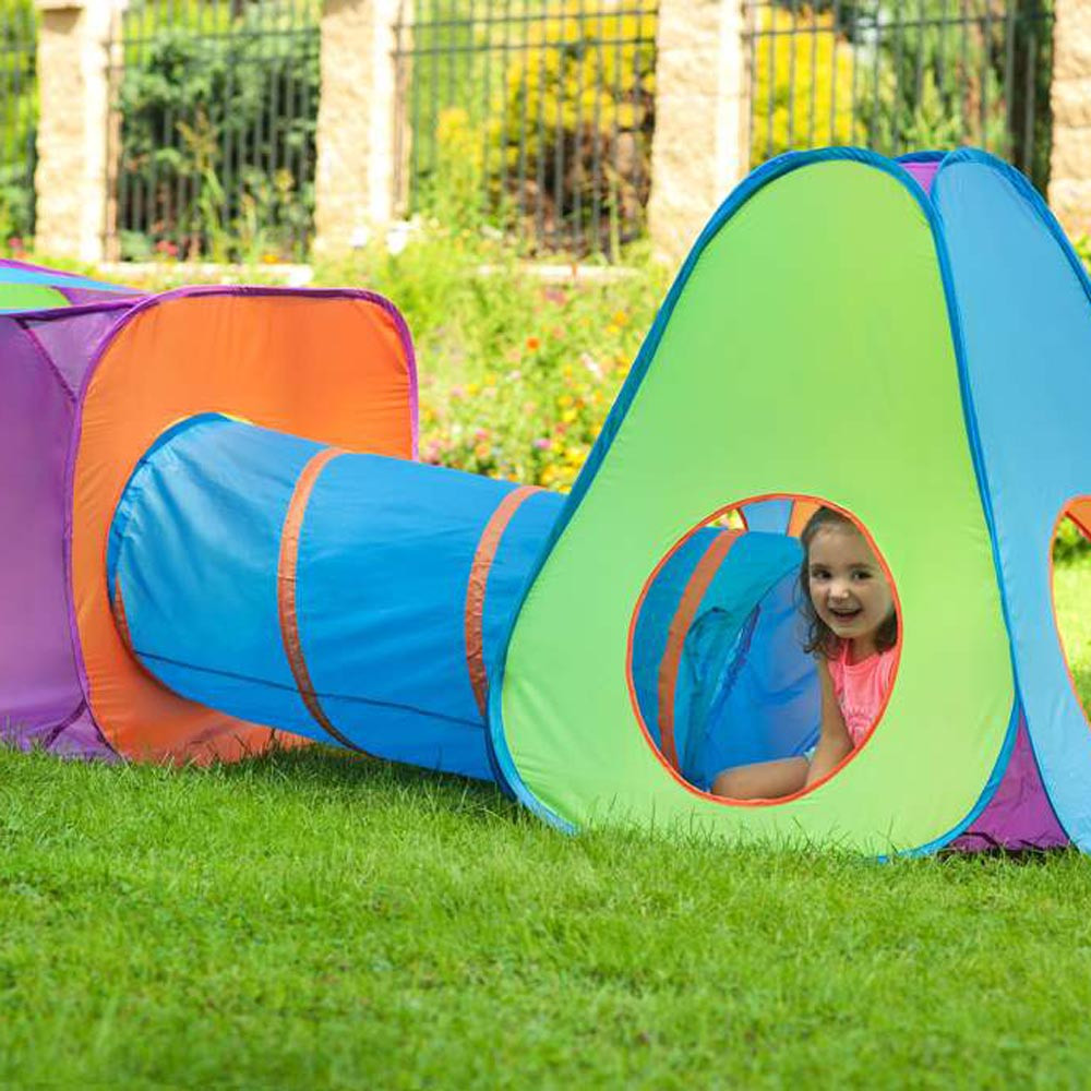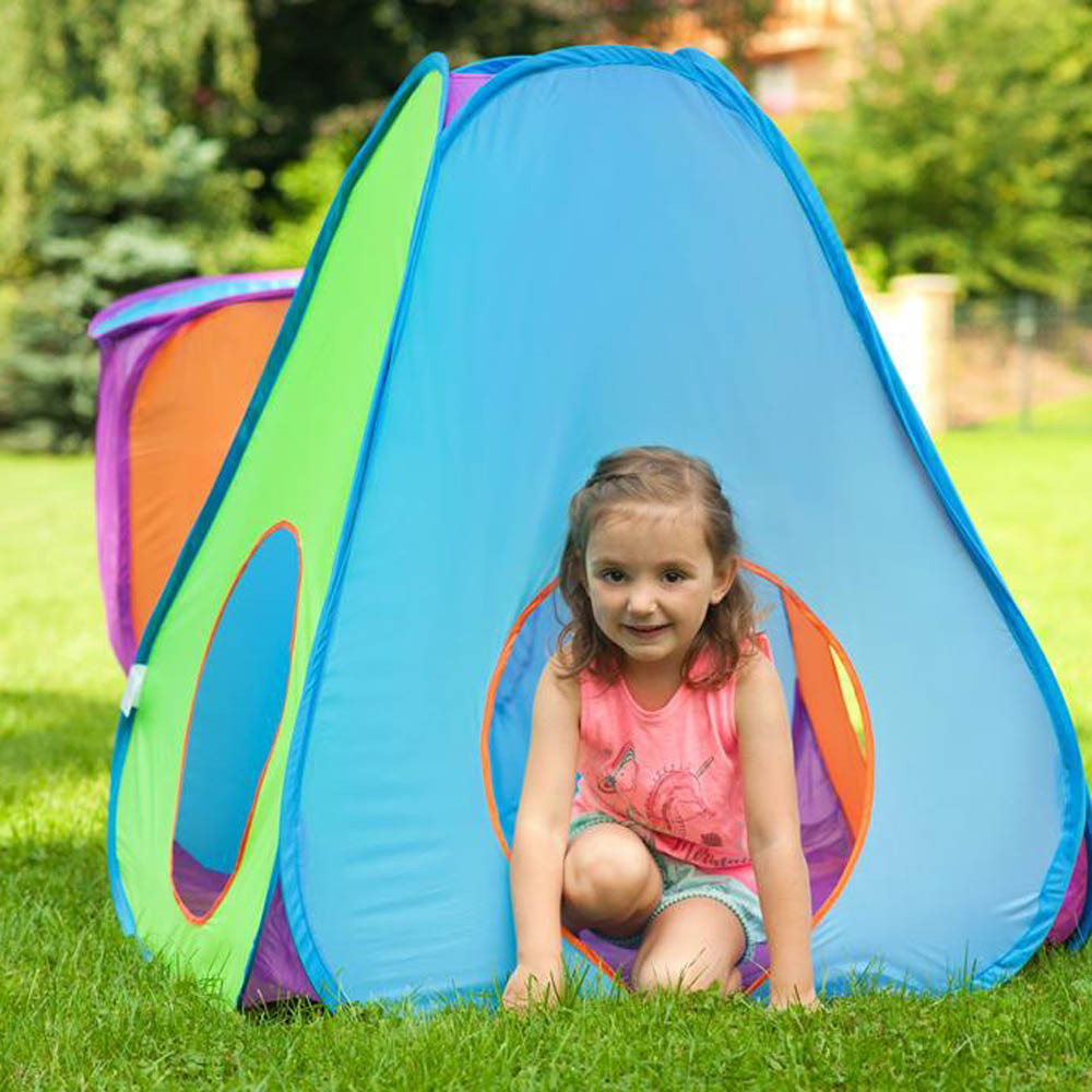 Gyerek sátor Baby Mix 3az1-ben. Három darabból álló készlet, amely két külön sátrakból áll, amelyeket egy alagút kapcsol össze.