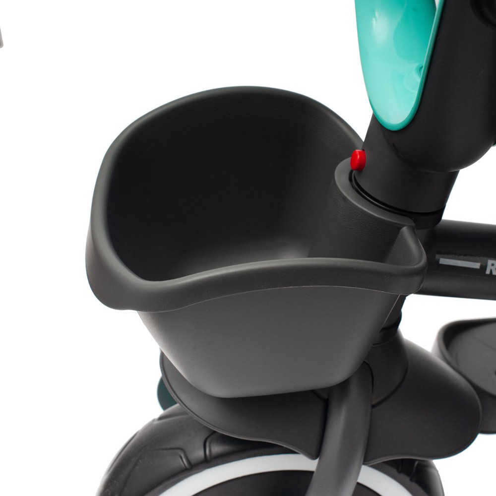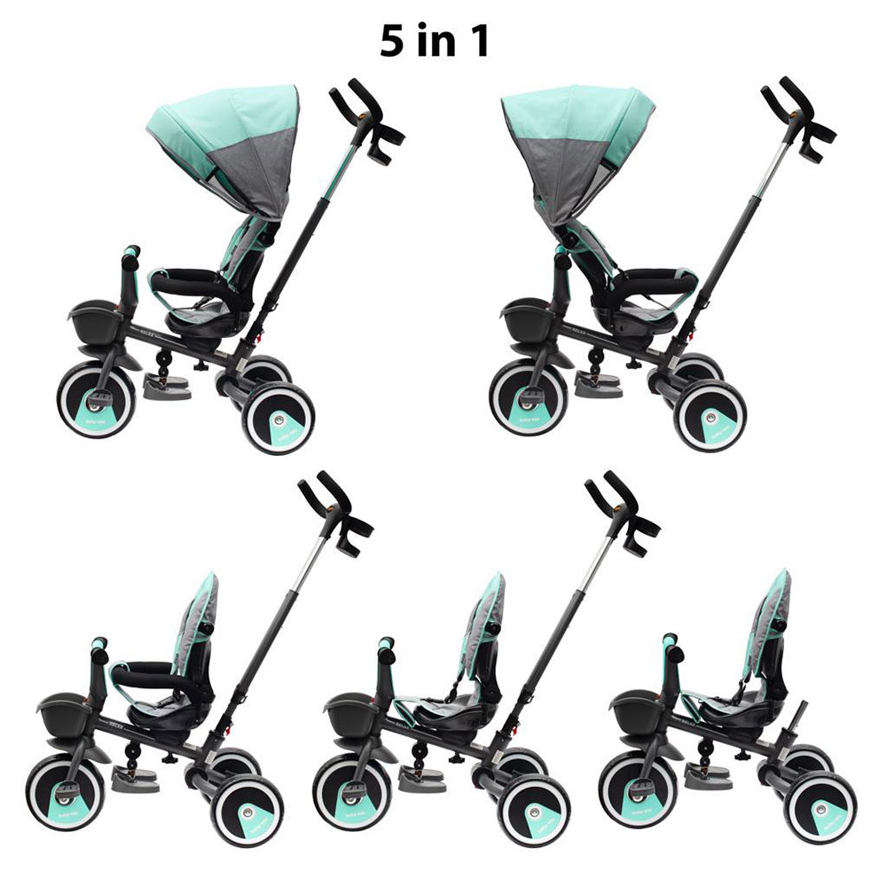 A Baby Mix 5 az 1-ben RELAX pedálos gyerek tricikli egy többfunkciós járgány, amely a többi GROW UP termékhez hasonlóan együtt nõ a gyerekkel. A triciklit a gyermek és a szülõ is kezelni tudja egy állítható tolókar segítségével. A tolókar, a napellenzõ és egyéb alkatrészek eltávolítása után a járgány tricikliként funkcionál. Modern felépítésû tricikli ergonomikus kialakítású, kényelmes üléssel, amely eltolható és 360 fokban elforgatható, így a gyerek a haladási irányban vagy azzal szemben is haladhat. Kiváló minõségû, tartós anyagokból készült, összecsukható szerkezetének köszönhetõen könnyen szállítható például a csomagtartóban. Összeszerelése rendkívül egyszerû és intuitív, nem igényel szerszámokat. A közlekedés során a levehetõ kiesésgátló keret, az ötpontos biztonsági öv, a megerõsített EVA habból készült kényelmes lábtartók és kerekek gondoskodnak a kényelemrõl és biztonságról, amelyek nagyszerûen elnyelik az ütéseket, tökéletes tapadást biztosítanak, és nem igényelnek utánfújást. Praktikus kosarában játékok és más kellékek is tárolhatók.