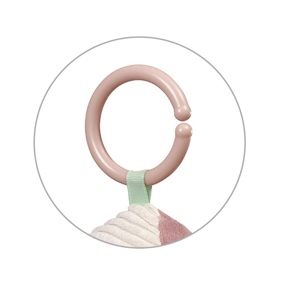 Plüss kockánk praktikus akasztóval van ellátva. Könnyen rögzíthetõ kiságyra, babakocsira vagy hordozóra. Gyermeked otthon, séta és utazás közben is játszhat vele.