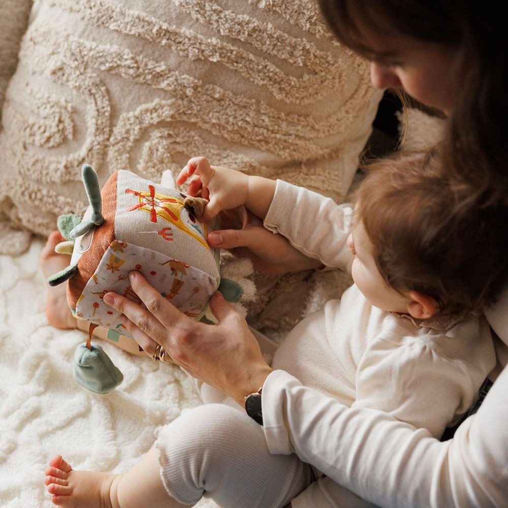 A gyerekeknek szóló aktivitáskocka egy susogó játékot és egy finom csörgõt is rejt, amelyek serkentik a hallást. A kiálló szalagok és zsinórok a fogásra ösztönzik, a biztonságos tükör pedig arra ösztönzi õket, hogy felfedezzék saját tükörképüket. Az önálló felfedezés segíti gyermeked koncentrációjának és finom motoros készségeinek fejlõdését.