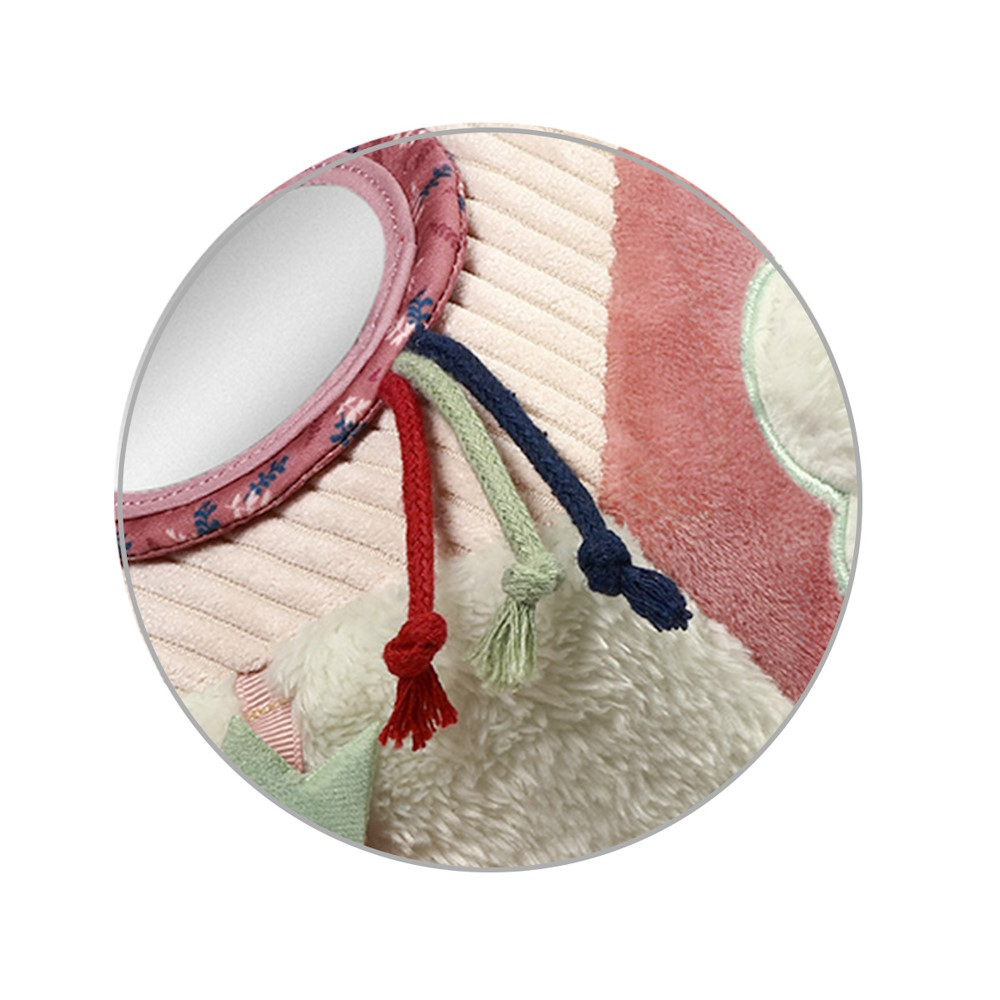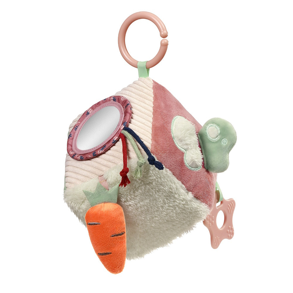 A gyerekeknek szóló aktivitáskocka egy susogó játékot és egy finom csörgõt is rejt, amelyek serkentik a hallást. A kiálló szalagok és zsinórok a fogásra ösztönzik, a biztonságos tükör pedig arra ösztönzi õket, hogy felfedezzék saját tükörképüket. A puha rágóka kellemesen masszírozza az ínyt.