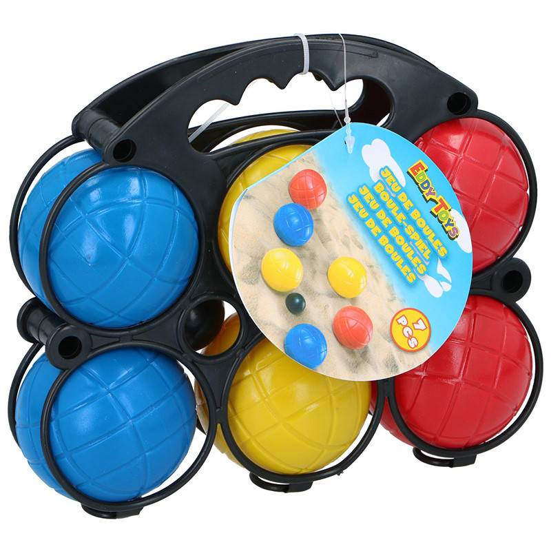 7 műanyag labdából álló boccia szett.Nagyszerű szórakozást biztosít a strandon, a parkban vagy a kertben, és a kényelmes műanyag golyóknak köszönhetően a gyermekek számára is tökéletesen alkalmas.A készlet kompakt hordozókosárban érkezik, fekete célgolyóval, így bármikor magaddal viheted a nyaralásra.A készlet mérete: 22 x 19 x 7 cm