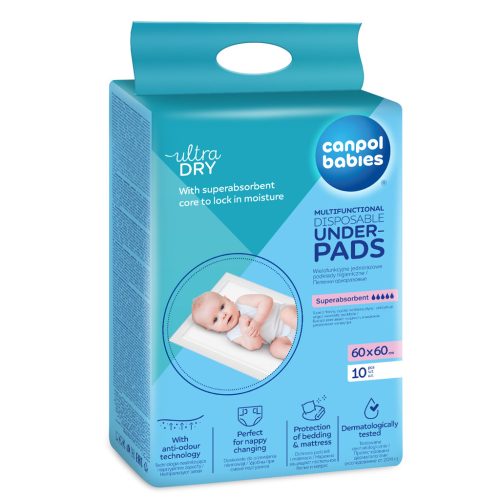 A Canpol babies multifunkciós higiéniai alátétek vízálló védőréteggel a betét alján tökéletesek számos helyzetben. A szuperabszorbens alátét gyorsan felszívja a folyadékokat és megtartja a nedvességet az alátét belsejében. A higiéniai alátétek nélkülözhetetlenek a nők számára a szülés utáni időszakban. Hasznosak a baba pelenkázásakor, utazáskor, klinikai látogatáskor vagy matracvédelemként (átnedvesedő pelenka, böfögés stb.), valamint a vetkőzés gyakorlásakor.