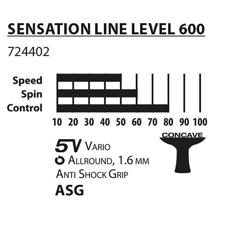 A csúszásgátló nyél és a rezgéscsillapító a Sensation vonal speciális tulajdonsága. A puha ütés és izzadás elnyelő grip segítségével jobb fogást és kényelmesebb játékot biztosít.Technikai adatok: - Sebesség: 50 - Csavarás: 60 - Irányítás: 80 - Konkáv nyél - Rezgéscsillapító grip - A gumiborítás vastagsága: 1.6 mm