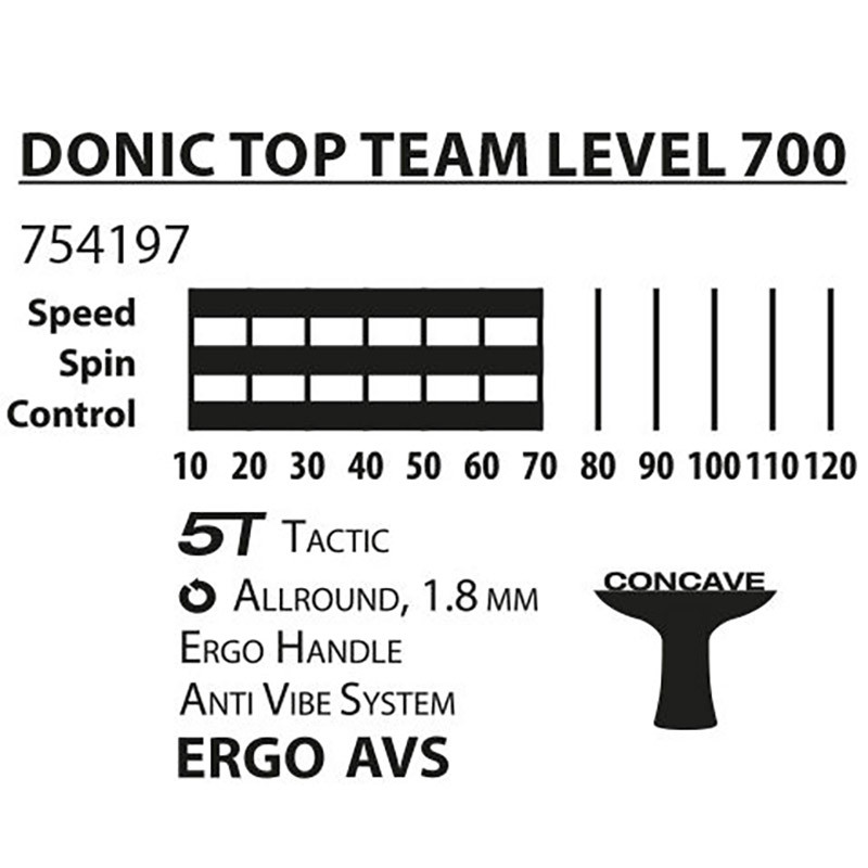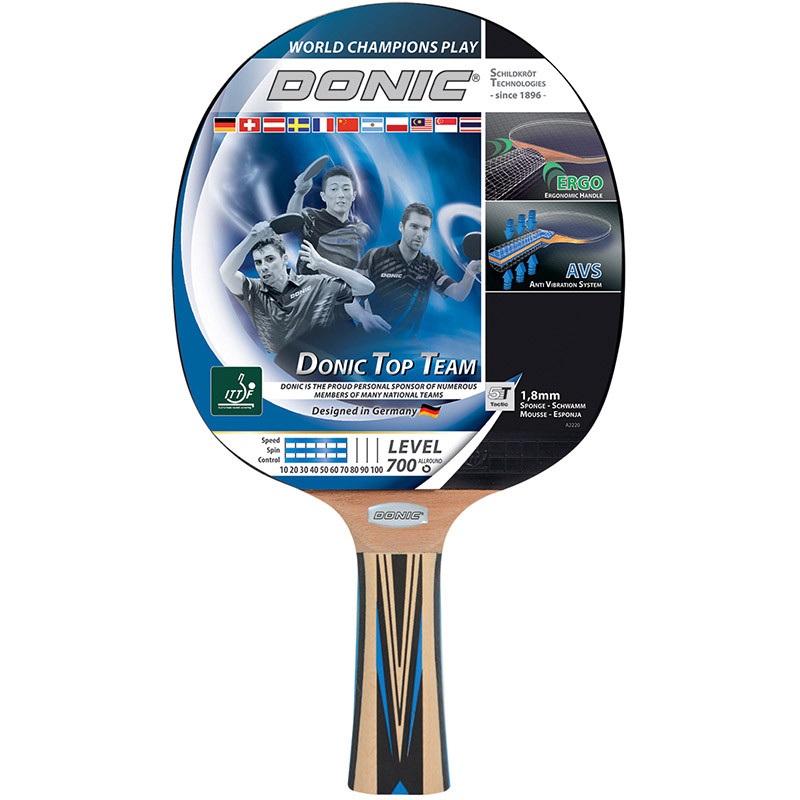 Olyan nemzeti válogatott játékosokat mint Li Ping (Kína), Kirill Skachkov (Oroszország), vagy Barce Olivier (Franciaország) támogat a Donic Ezeknek a játékosnak készült a Top Team széria amely el van látva többek közt rezgéscsillapítóval, ergonomikus nyéllel és erősítő rendszerrel (PLS).A Power Light System (PLS) csökkenti a lap súlyát és átviszi a súlypontot a lap tetejébe, így még több erőt és sebességet kínál miközben az egyensúlyt is megőrzi.Technikai adatok:- Sebesség: 70- Csavarás: 70- Irányítás: 70- 1.8 mm a gumiborítás vastagság- Ergonomikus nyél- Erősítő rendszer- Rezgéscsillapító