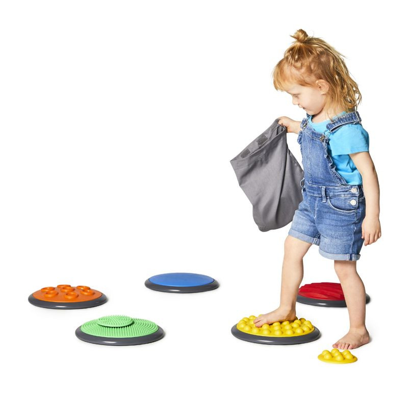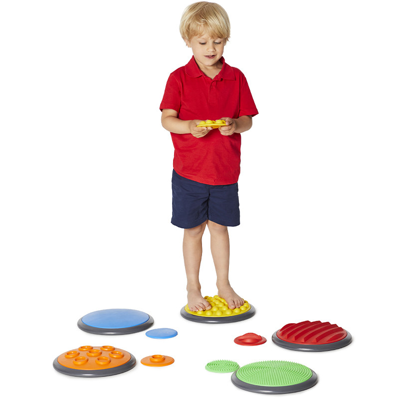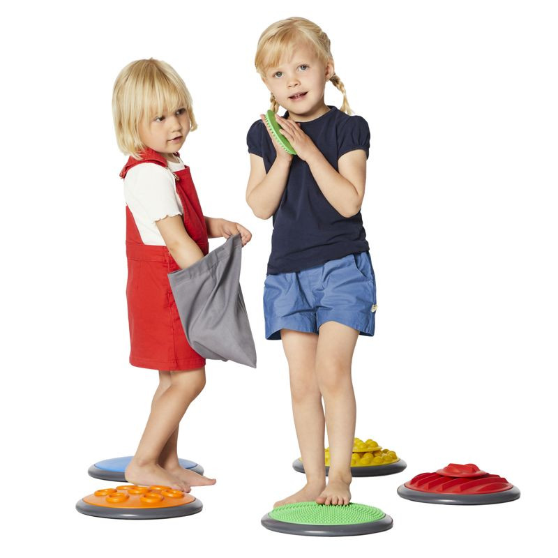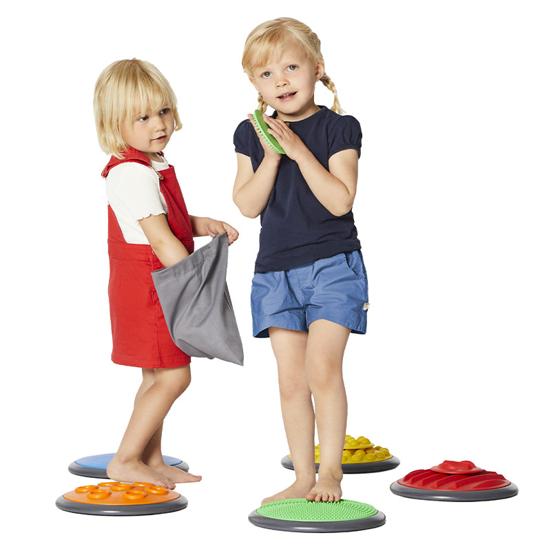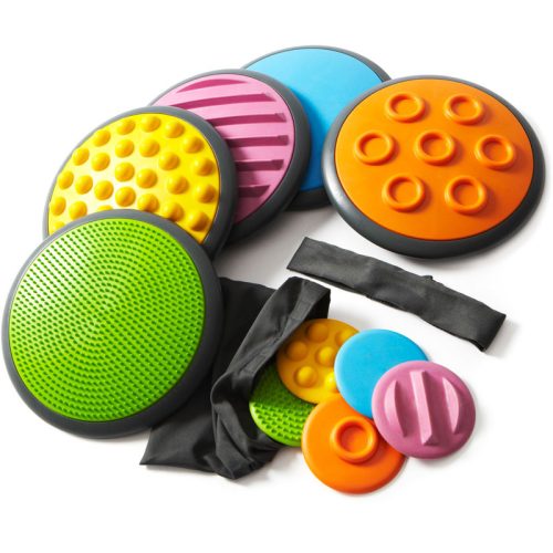 A gyerekeknek kézzel és lábbal kell különbséget tenni a különböző mintájú és keménységű korongok között.