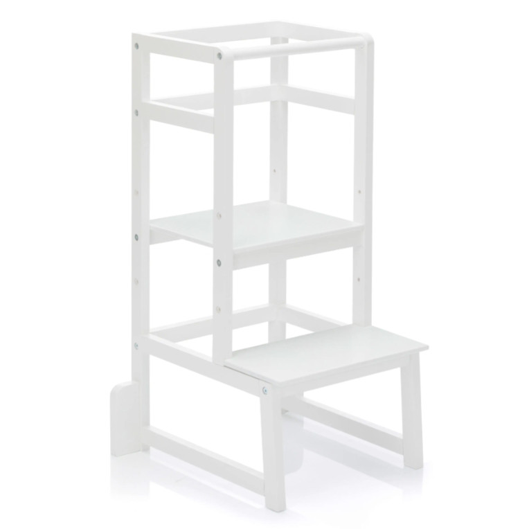 Nem csak ránézésre szép és modern, de egyszerû kialakításával minden lakókörnyezetbe tökéletesen illeszkedik és rendkívül stabil, és oldalsó támaszaival valamint masszív felépítésével kiváló védelmet nyújt a felborulás ellen. Mivel kicsikéink olyan gyorsan nõnek, így az alaplap magassága is tökéletesen állítható a gyermek pillanatnyi magasságához. Amint elsajátították a felfelé vezetõ utat, a kerek rúd a tartásra és természetesen a kiesés elleni védelemre szolgál. Így gyermekünk bárhol segíthet, legyen szó fõzésrõl, sütésrõl vagy akár fogmosásról, ez a torony ideális segítõ, amikor a lábak rövidnek tûnnek. A szülõkkel vagy idõsebb testvérekkel szemmagasságban való játék és tanulás segít a gyermeknek abban, hogy nagyon gyorsan megtapasztalja a szociális interakciókat, fejleszti készségeit, és segít megerõsíteni az egymás közötti kötõdést.