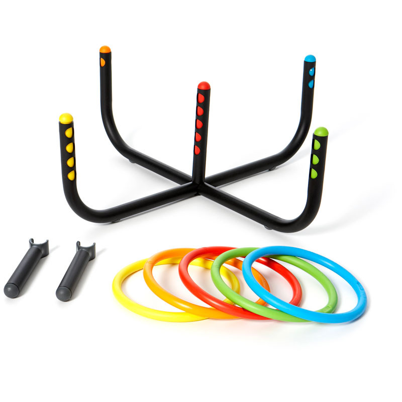 Az karikadobáló anyaga fém, míg a karikák gumiból készültek.
