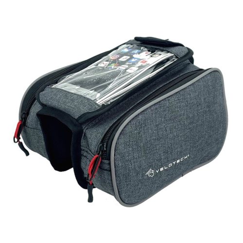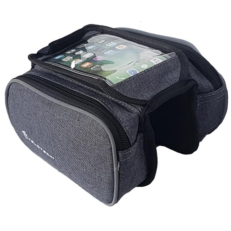 Telefontartós váztáska 3 részesÁtlátszó PVC felsőrész a telefon használatához.Tépőzáras kivitelezés a gyors le és felszereléshez.A legtöbb fajta kerékpárhoz megfelelő. Fényvisszaverő csík körben a széleken.Technikai adatok: - Anyaga: 600D vízlepergető poliészter - Szín: Sötét szürke - Méret: 18 x 11 x 13 cm