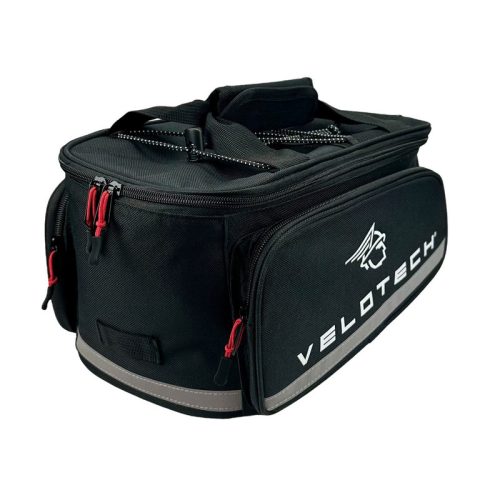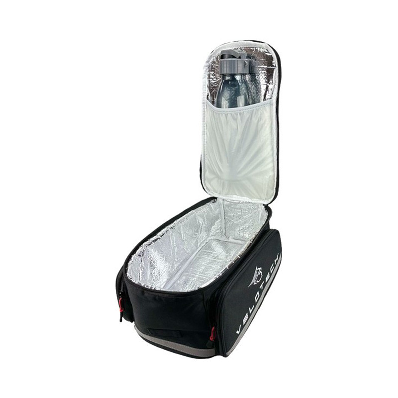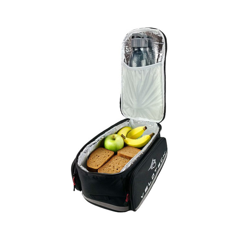 Csomagtartó táska, 1 részes, termobéléssel.Anyaga: 600D vízlepergető polyesterSzín: feketeFő rekesz termobéléssel (üdítők, romlandó élelmiszerek hidegen tartására) és belső zsebbel.Méretes oldalsó zsebekkel.Tetején hálós és gumírozott zseb, fogófül.Körbe fényvisszaverő csík, hátul lámparögzítési pontMéretek: 30 x 18 x 25 cmŰrtartalom: 13,5 liter
