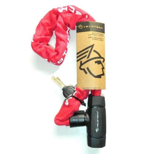 Kerékpár lezáró, láncos, integrált fejjel.Technikai adatok: - 8 mm-es kör keresztmetszetű - Anyag: titán-acél ötvözet - Méret: 8 mm x 900 mm - Szín: piros gyöngyvászon borítás, fehér felirattal - VELOTECH logóval - Zárása: biztonsági kulccsal