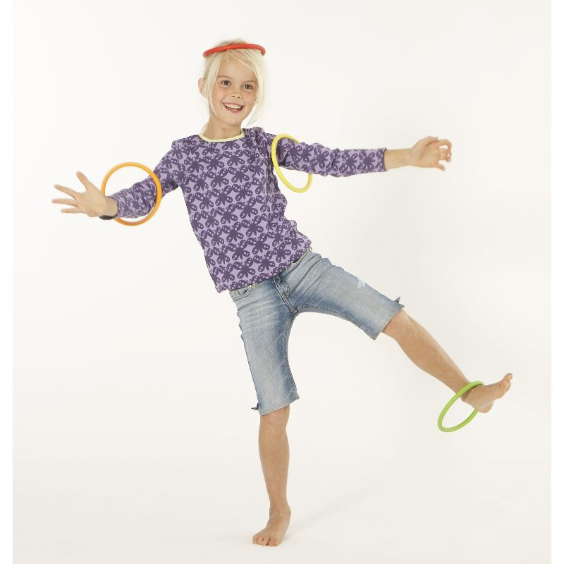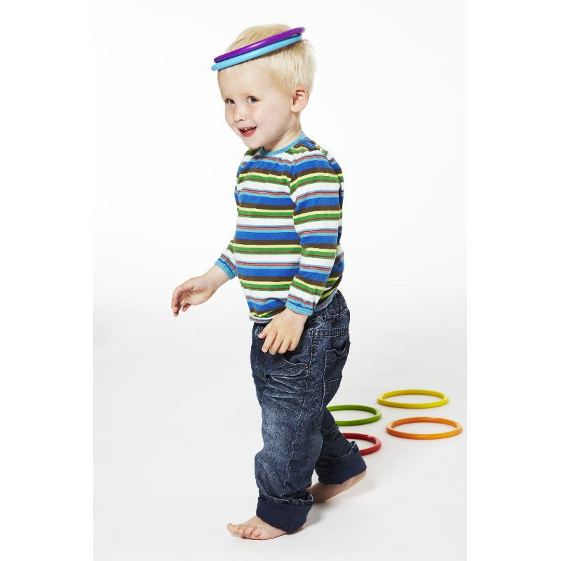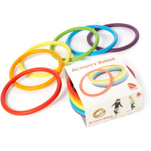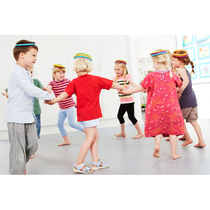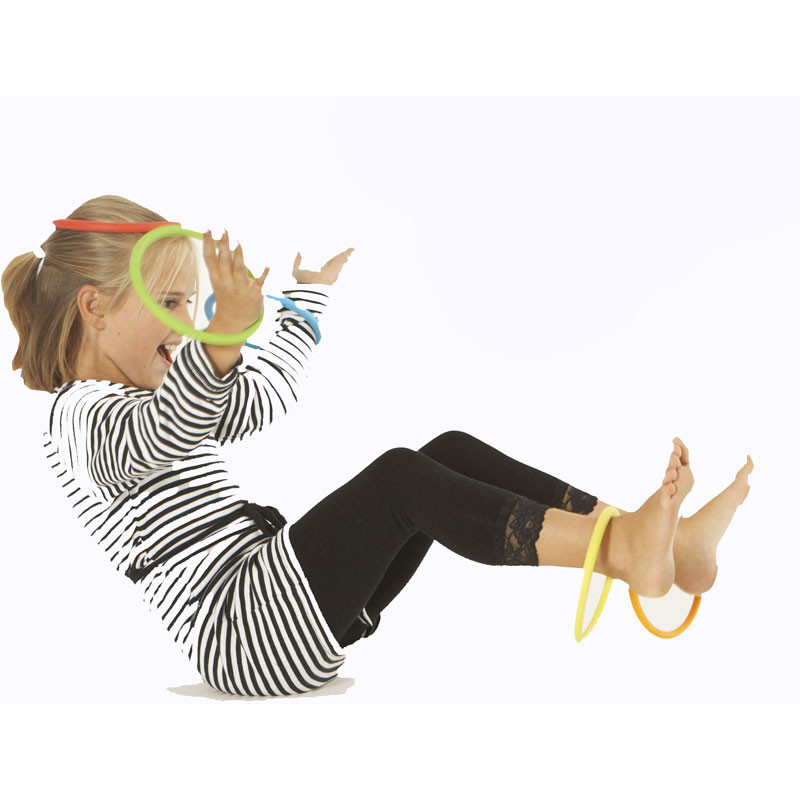 Új, élénk színű karikák minden korosztály számára. A karikáknak rengeteg felhasználási módja van: egyensúlyozhatunk velük a fejünkön, pályákat alakíthatunk ki, melyeken lábujjhegyen végigmehetünk vagy körbetáncolhatjuk, pörgethetjük lábunkon és kezünkön, dobálhatjuk egymásnak, vagy akár lábainkra húzva ugrálhatunk velük. A karikák alkalmazhatóak csoport tevékenységekhez is.A készlet 6 db színes karikát tartalmaz.Technikai adatok: - Méret: 16,4 x 1,32 cm - Anyag: puha mesterséges gumi