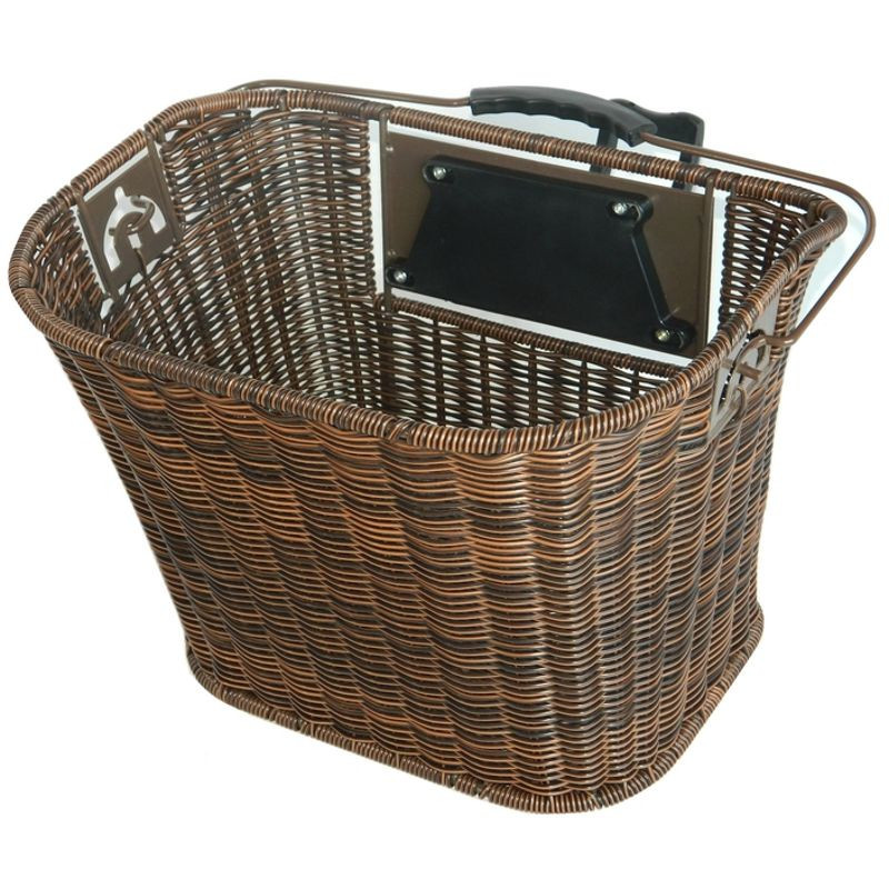 Rattan hatású barna műanyag fonott kerékpár kosár.Bevásárláshoz ideális.Gyorskioldós adapterrel szerelhető a kormányra.Méret: 33 x 22 x 26 cm