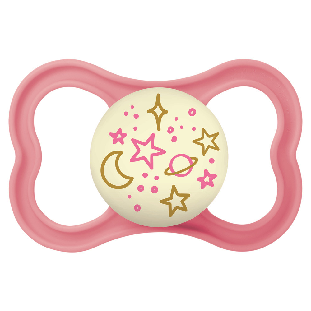 Az extra vékony és rugalmas szívóka lehetõvé teszi a zárt szájtartást, hogy a babák természetes módon tudják becsukni a szájukat cumizás közben. Ez a fogaknak elegendõ helyet hagy a normál növekedéshez. Az extra nagy szellõzõlyukaknak köszönhetõen különösen kíméletes a babák érzékeny bõréhez. A cumi gombja világít a sötétben.