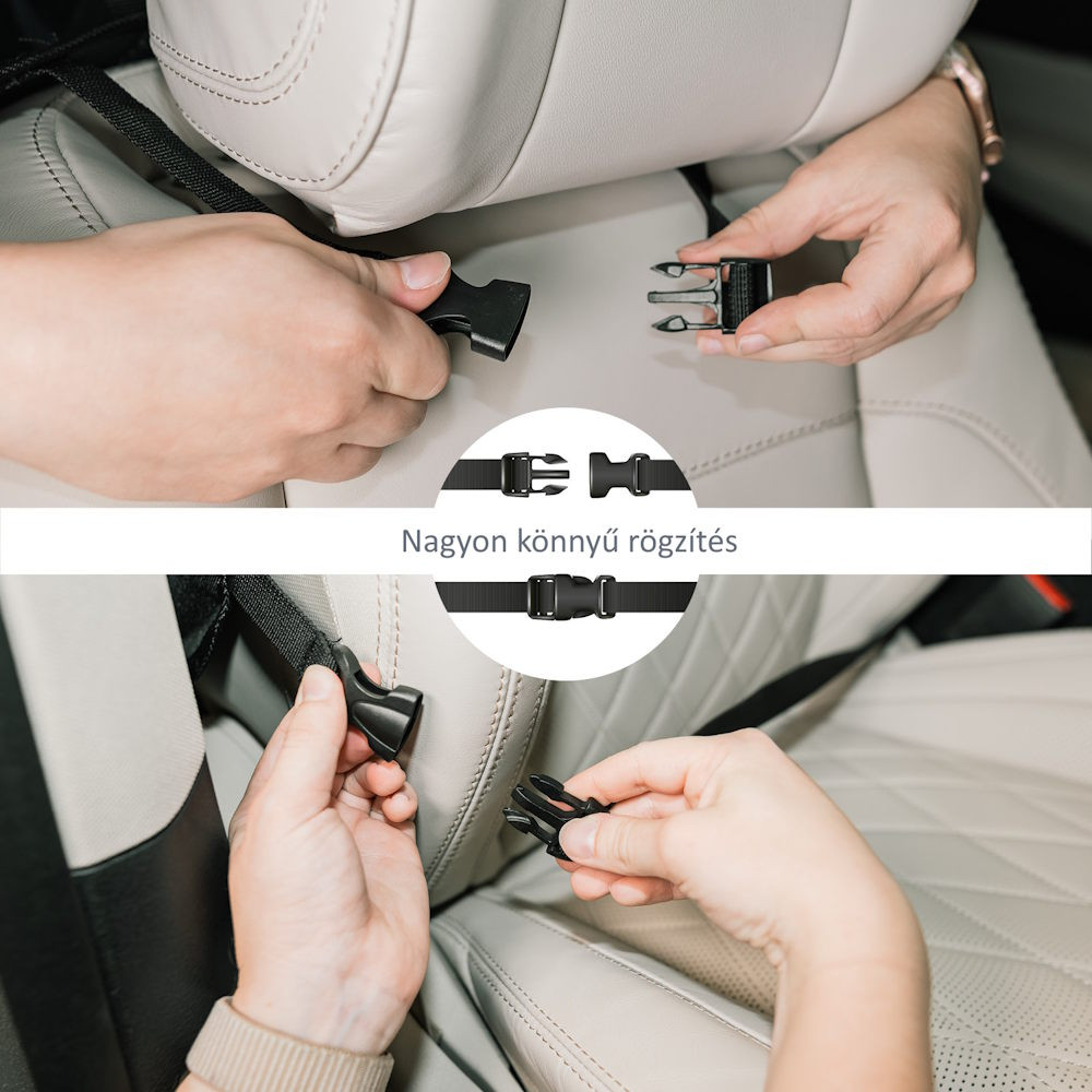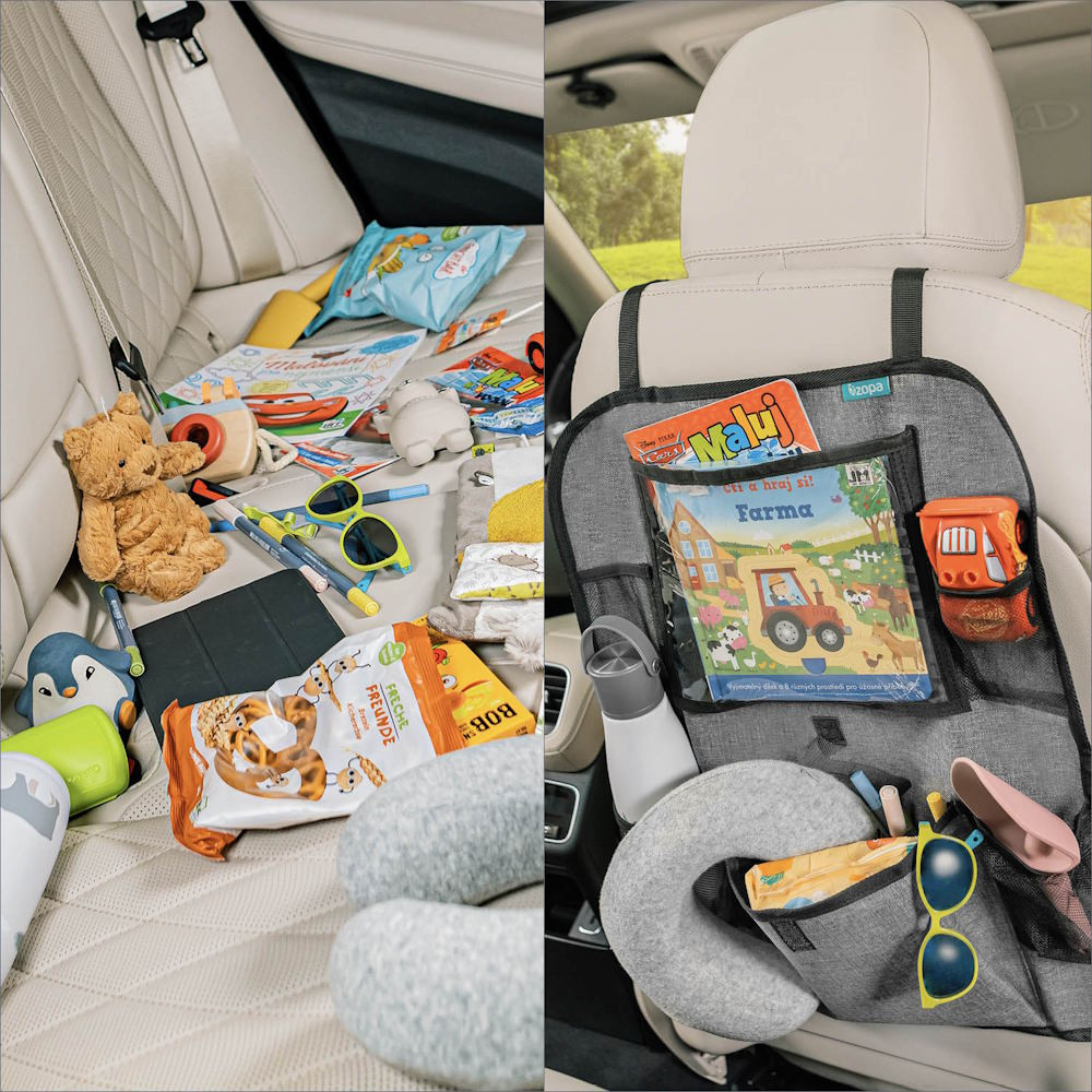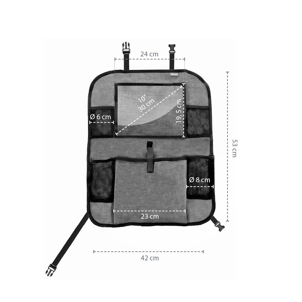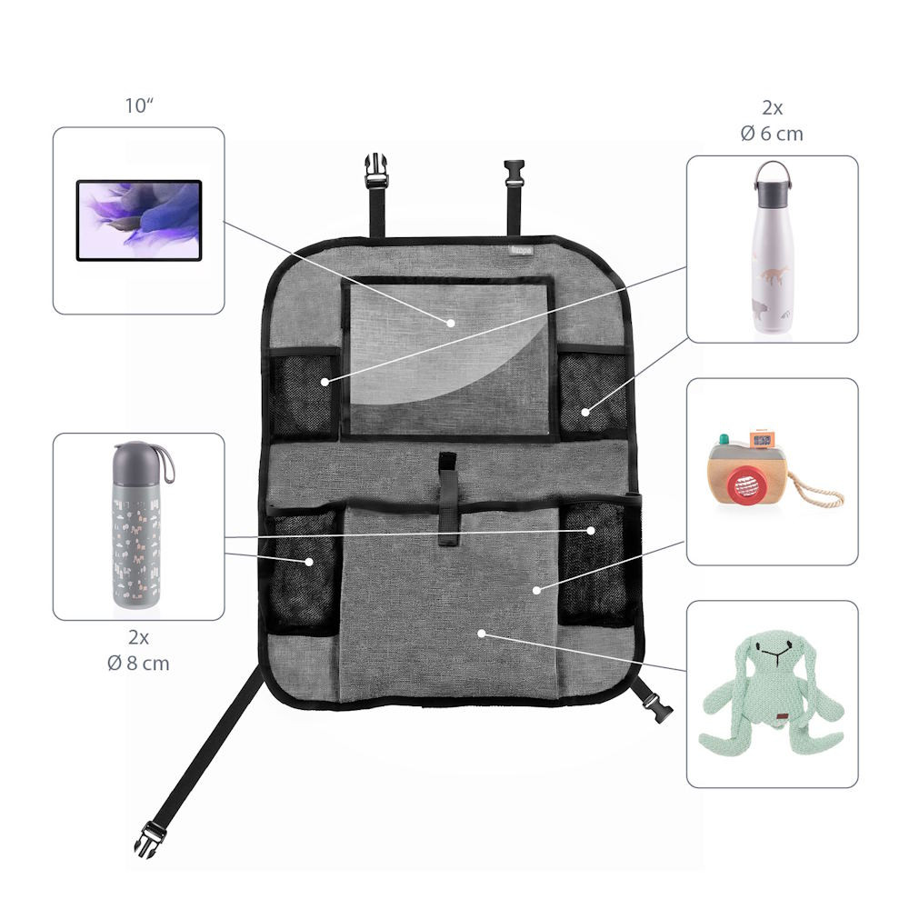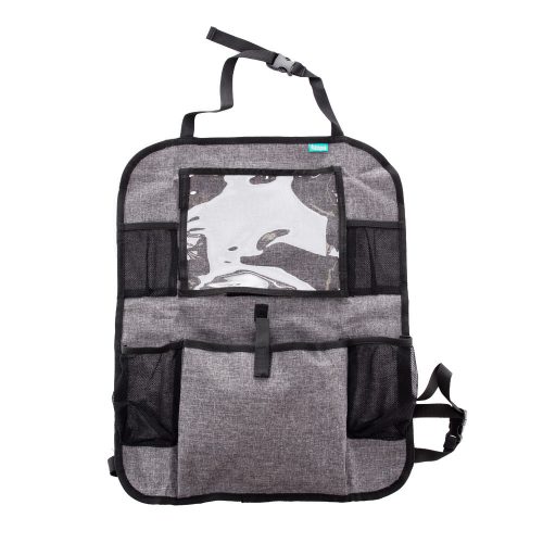 A tablet tartó zsebbel rendelkezõ praktikus ülésre szerelhetõ rendezõ ideális társ, ha gyerekkel utazik. A tablet tartó zseb óvja a tablet érintõképernyõjét, és a segítségével gyorsan hozzáférhetõ a készülék. Mivel a zseb átlátszó, jól látható, hogy mit tartalmaz. Ezenkívül a rendezõ két italtartót tartalmaz. Univerzális jellegének köszönhetõen az ülés gyakorlatilag minden jármûvel kompatibilis. A rögzítését állítható hosszúságú praktikus klipek könnyítik meg, amelyeknek köszönhetõen szabályozni az elhelyezkedése. Ezenkívül az út során nélkülözhetetlen apróságok tárolására egy további zsebet, valamint két mobilt- és kulcstartó hálós zsebet is tartalmaz.